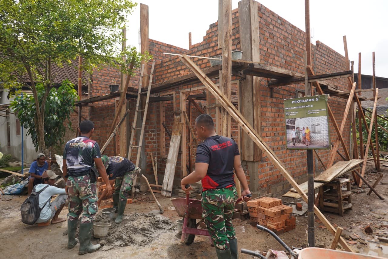 Pesawaran — Program TNI Manunggal Membangun Desa (TMMD) yang dilaksanakan oleh Kodim 0421/LS menunjukkan kemajuan yang signifikan di Desa Tanjung Rejo, Kecamatan Way Khilau, Kabupaten Pesawaran. Dalam inisiatif ini, rumah yang menerima manfaat berupa rehab Rumah Tidak Layak Huni (RTLH) atas nama Ibu Siti Hamdiah kini telah memasuki tahap penting, yaitu pemasangan batu bata serta kusen untuk pintu dan jendela.