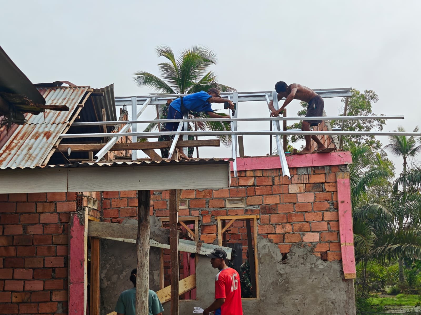 Saat ini, fokus utama tim adalah pada pemasangan rangka baja yang berfungsi sebagai struktur atap utama rumah. Proses ini dilakukan dengan sangat teliti, bertujuan agar konstruksi bangunan menjadi kuat dan bertahan lama.