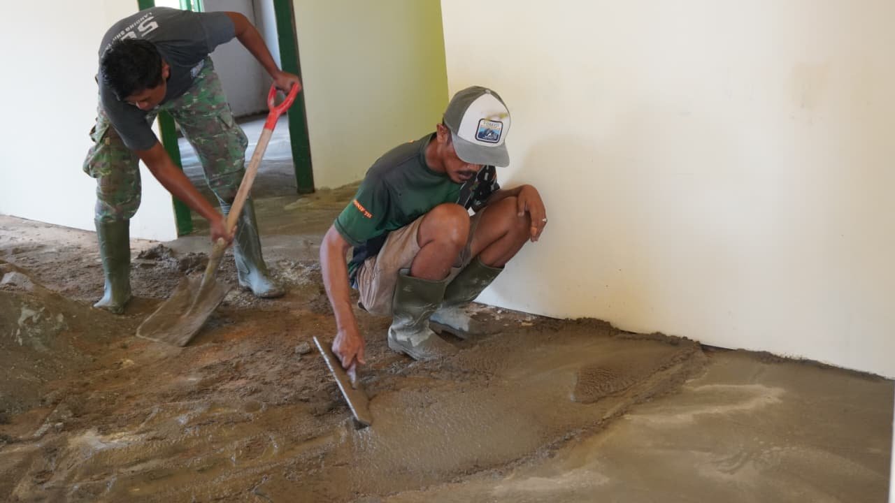 Anggota Satgas TMMD terlihat sangat hati-hati saat meratakan campuran semen di seluruh area lantai. Mereka mengawasi setiap sudut agar tidak ada bagian yang bergelombang, sehingga standar kualitas bangunan tetap terjaga dengan baik.