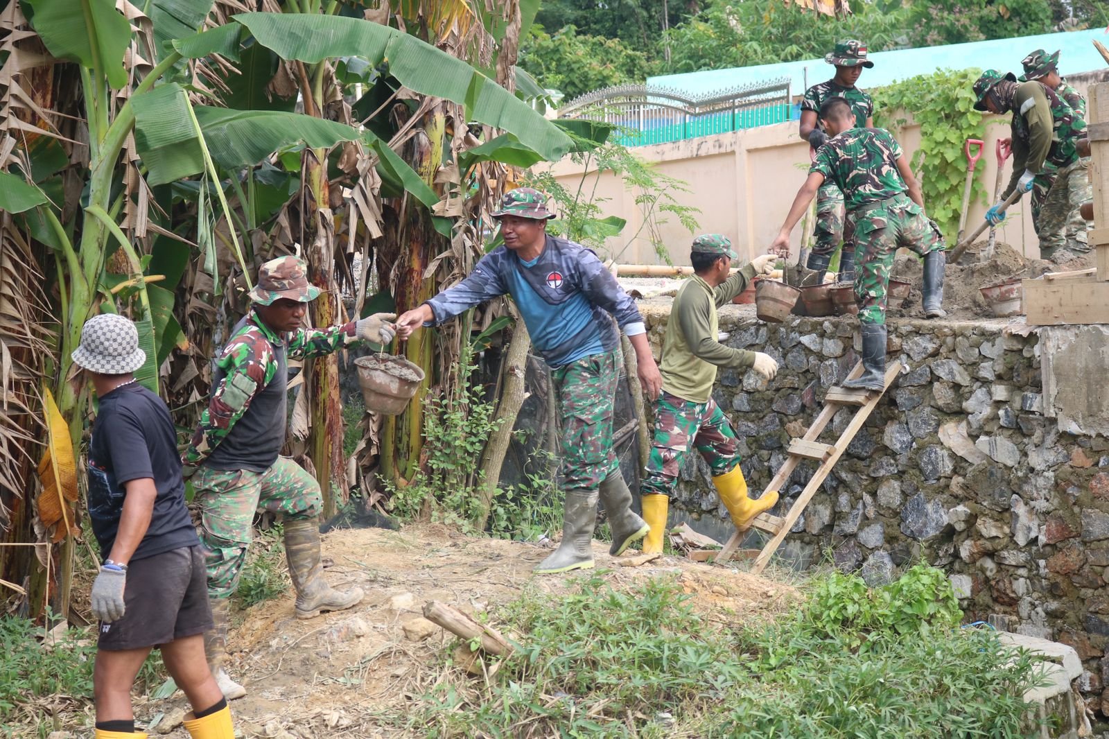 TNI dan warga setempat terlihat bekerja sama dalam menyusun material, bertujuan untuk menciptakan struktur yang solid guna mengantisipasi masalah seperti abrasi dan potensi tanah longsor di daerah tersebut. Meskipun kondisi medan cukup menantang, semangat dan disiplin dalam bekerja di lapangan tetap terjaga, sehingga target penyelesaian proyek dapat dicapai sesuai dengan jadwal yang telah ditetapkan.