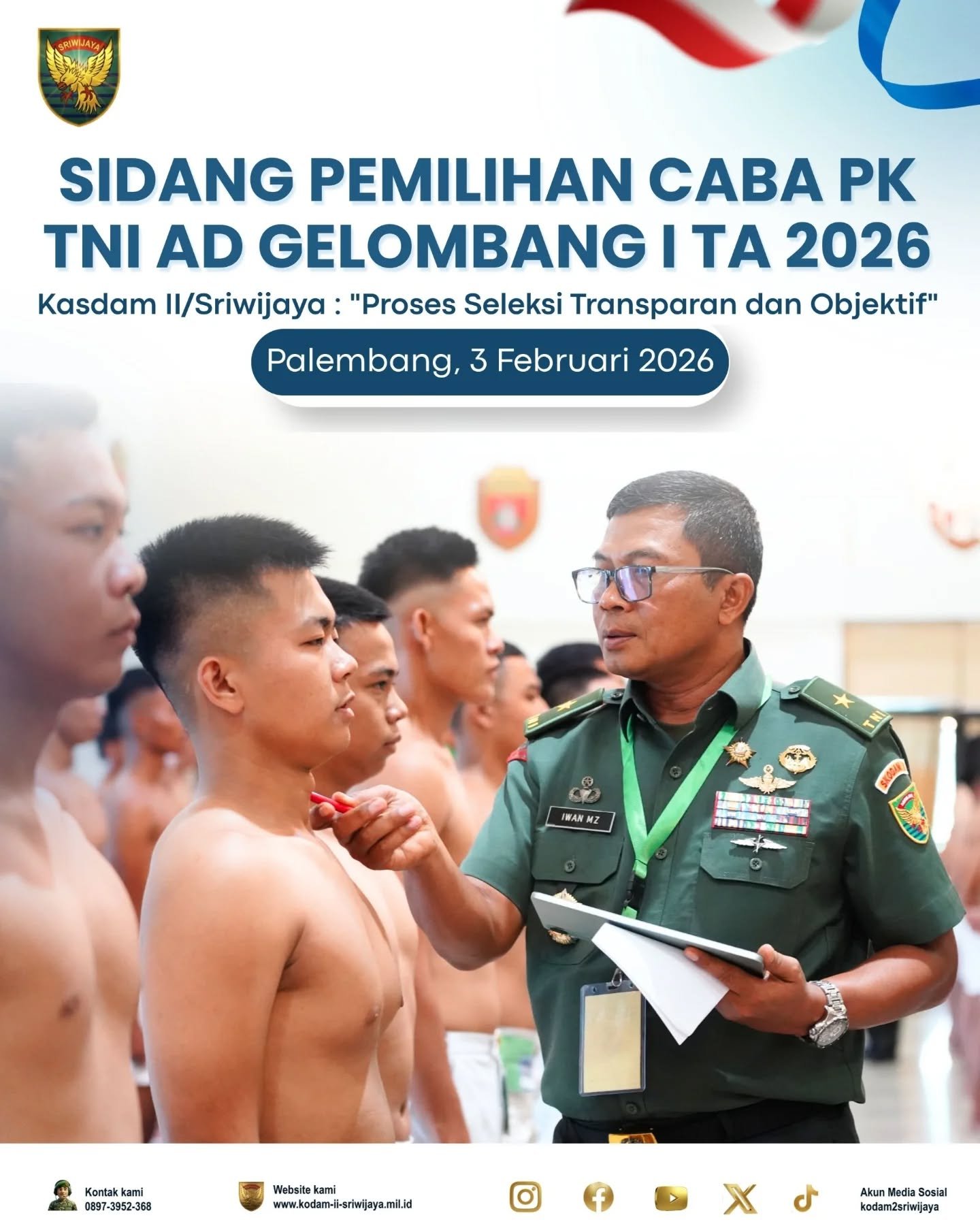Brigjen TNI Iwan Ma’ruf Zainudin, Kepala Staf Kodam II/Sriwijaya, memimpin Sidang Pemilihan Tingkat Panitia Daerah (Panda) untuk penerimaan Calon Bintara PK TNI Angkatan Darat Gelombang I Tahun Anggaran 2026 yang diadakan di Gedung Sudirman Makodam II/Sriwijaya, Palembang, pada Selasa (3/2/2026). Acara ini merupakan langkah penting dalam memilih kandidat prajurit yang akan menjalani proses seleksi lebih lanjut di tingkat Sub Panitia Pusat (Panpus).