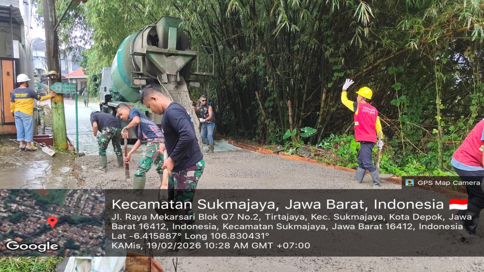 Depok – Pelaksanaan program TNI Manunggal Membangun Desa (TMMD) Ke-127 Tahun Anggaran 2026 oleh Kodim 0508/Depok menunjukkan kemajuan yang signifikan. Pada hari ke-9 pelaksanaan, yakni pada Kamis, 19 Februari 2026, pengerasan jalan di area GDC Sektor Gardenia Blok Q RT 03/07, Kelurahan Tirtajaya, Kecamatan Sukmajaya, Kota Depok, telah mencapai 44 persen. Pekerjaan ini mencakup jalan sepanjang 222 meter dengan lebar 4,5 meter yang tetap dilanjutkan meskipun hujan menguyur sejak pagi hingga siang, dan gerimis pada sore harinya. Para anggota Satgas TMMD, yang terdiri dari gabungan TNI, Polri, Pemda, dan masyarakat, menunjukkan semangat tinggi dalam menyelesaikan proyek ini. Kegiatan ini melibatkan total 89 personel TNI AD, 10 dari TNI AL, 6 dari TNI AU, 10 dari Polri, serta 37 anggota Pemda, 10 Pemdes, dan 10 warga setempat. Dukungan berupa alat berat seperti 1 unit roller vibrator, stamper, genset, dan peralatan pertukangan lainnya turut memfasilitasi percepatan proses pengerjaan. Diharapkan, program ini dapat meningkatkan aksesibilitas bagi warga dan mendukung aktivitas ekonomi masyarakat di sekitar. Saat ini, keadaan di lokasi TMMD masih terpantau aman dan kondusif.