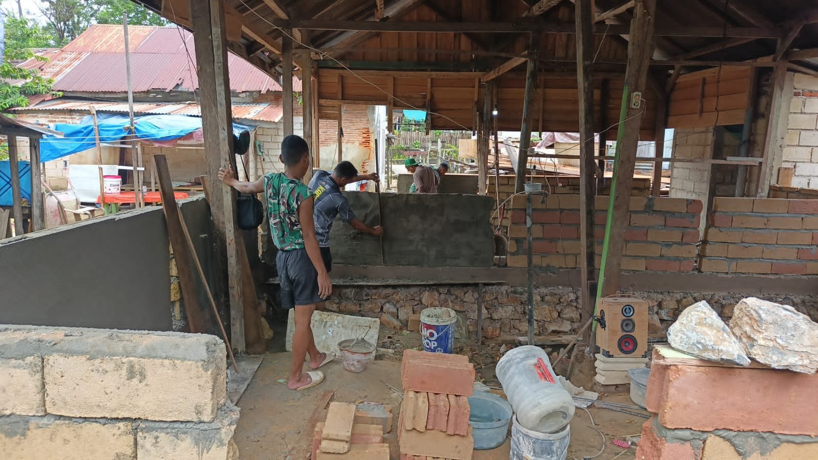 Mengandalkan campuran pasir dan semen, para prajurit bekerja keras untuk meratakan permukaan dinding dengan cermat. Kegiatan ini bertujuan untuk memastikan bahwa hasil plesteran yang didapatkan adalah kokoh dan rapi, memberikan fondasi yang kuat bagi tahap-tahap berikutnya.