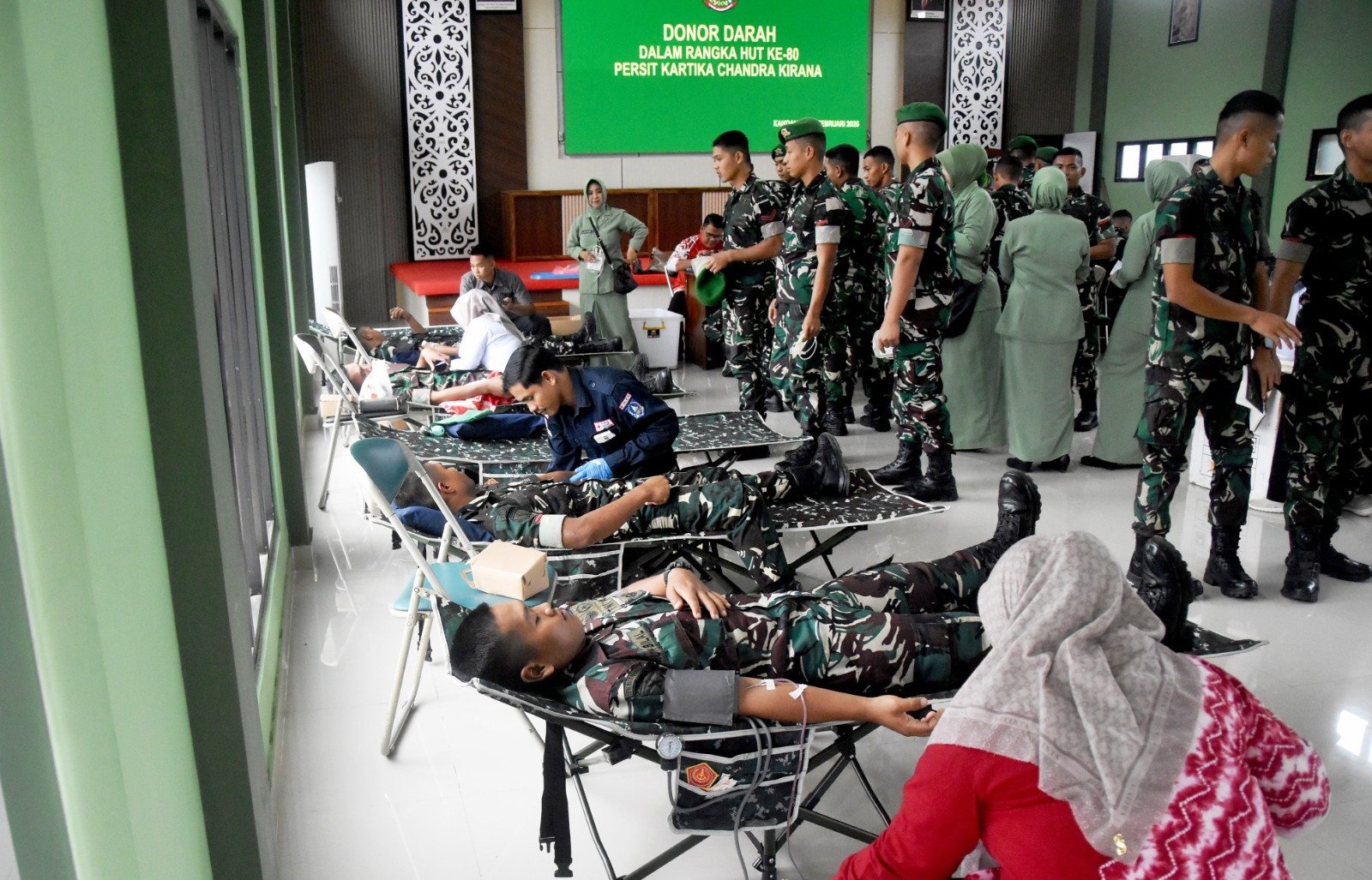 HULU SUNGAI SELATAN – Komando Distrik Militer (Kodim) 1003/Hulu Sungai Selatan (HSS) gelar aksi bakti sosial donor darah yang berkerjasama dengan Palang Merah Indonesia (PMI) Kabupaten HSS dalam rangka rangkaian kegiatan peringatan Hari Ulang Tahun (HUT) Persit Kartika Chandra Kirana (KCK) ke 80 tahun 2026 yang berlokasi di Aula Manunggal Makodim 1003/HSS Jl. A. Yani Kelurahan Kandangan Kabupaten HSS. Rabu (4/2/26)