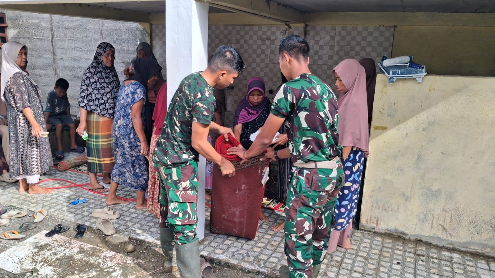 Sejak pagi, suasana masjid sudah dipenuhi aktivitas gotong royong. Sebagian prajurit menyapu halaman, sebagian lainnya membersihkan lantai dan rak Al-Qur’an. Sawang pada plafon juga dibersihkan agar ruangan masjid terlihat lebih rapi.