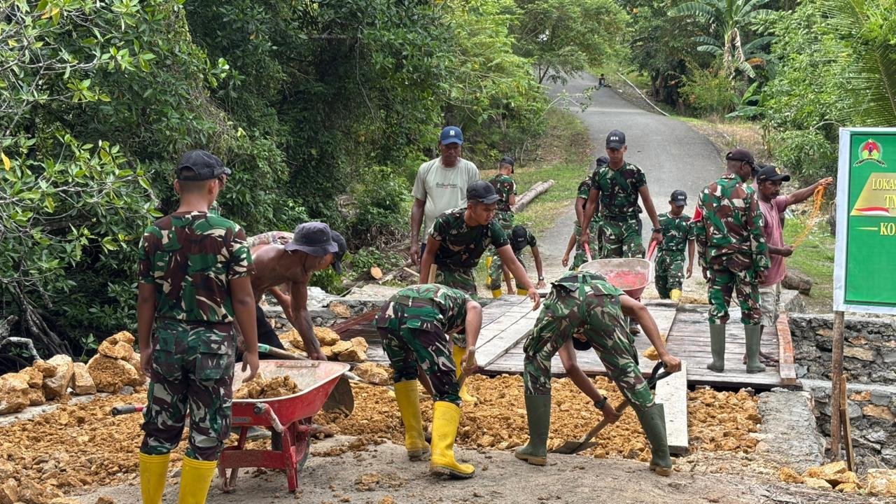 Kaimana – Personel dari Satuan Tugas TNI Manunggal Membangun Desa (TMMD) ke-127 yang berasal dari Kodim 1804/Kaimana melanjutkan aktivitas pembangunan jembatan di Kampung Marsi, Distrik Kaimana, Kabupaten Kaimana pada hari Jumat, 6 Maret 2026.