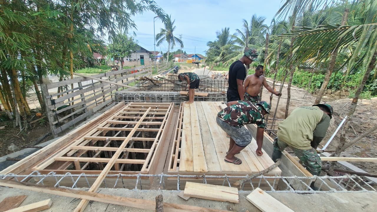 Kendari – Tim Satgas TNI Manunggal Membangun Desa (TMMD) ke-127 dari Kodim 1417/Kendari terus bekerja keras untuk menyelesaikan pembangunan jembatan di Kelurahan Sambuli, Kota Kendari, pada Rabu (25/2). Dalam tahap terbaru ini, anggota TNI dan masyarakat lokal terlihat sibuk merakit rangka besi, yang berfungsi sebagai tulangan utama dari struktur jembatan tersebut.