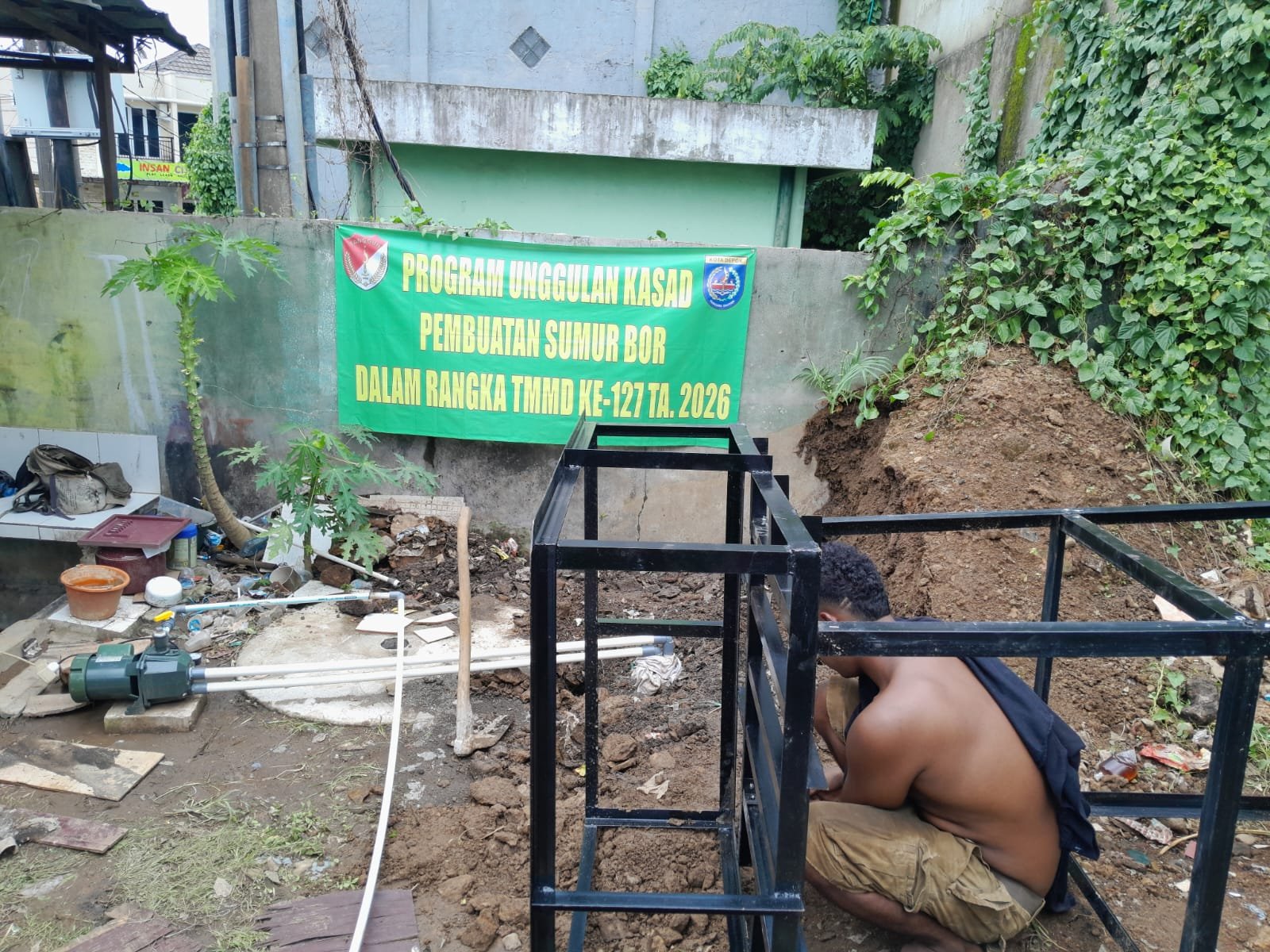 Fokus kegiatan hari ini terletak di Jl. Samudra Indonesia, Perum Mekar Perdana RT 02/22, Kelurahan Abadi Jaya, Kecamatan Sukmajaya, Kota Depok, di mana personel Satgas TMMD sedang dalam proses penyelesaian pembangunan Sumur Bor ke-IV. Hingga saat ini, progres pengerjaan telah mencapai 85 persen.