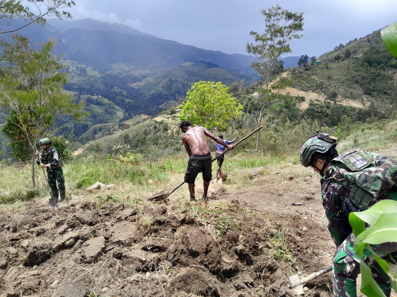 LANNY JAYA – Satgas Pamtas Kewilayahan Yonif 614/Raja Pandhita Pos Balingga bantu masyarakat dalam proses buka kebun masyarakat yang bertempat di Kampung Balingga, Distrik Balingga, Kabupaten Lanny Jaya, Papua Pegunungan, Jum’at, (15/11).