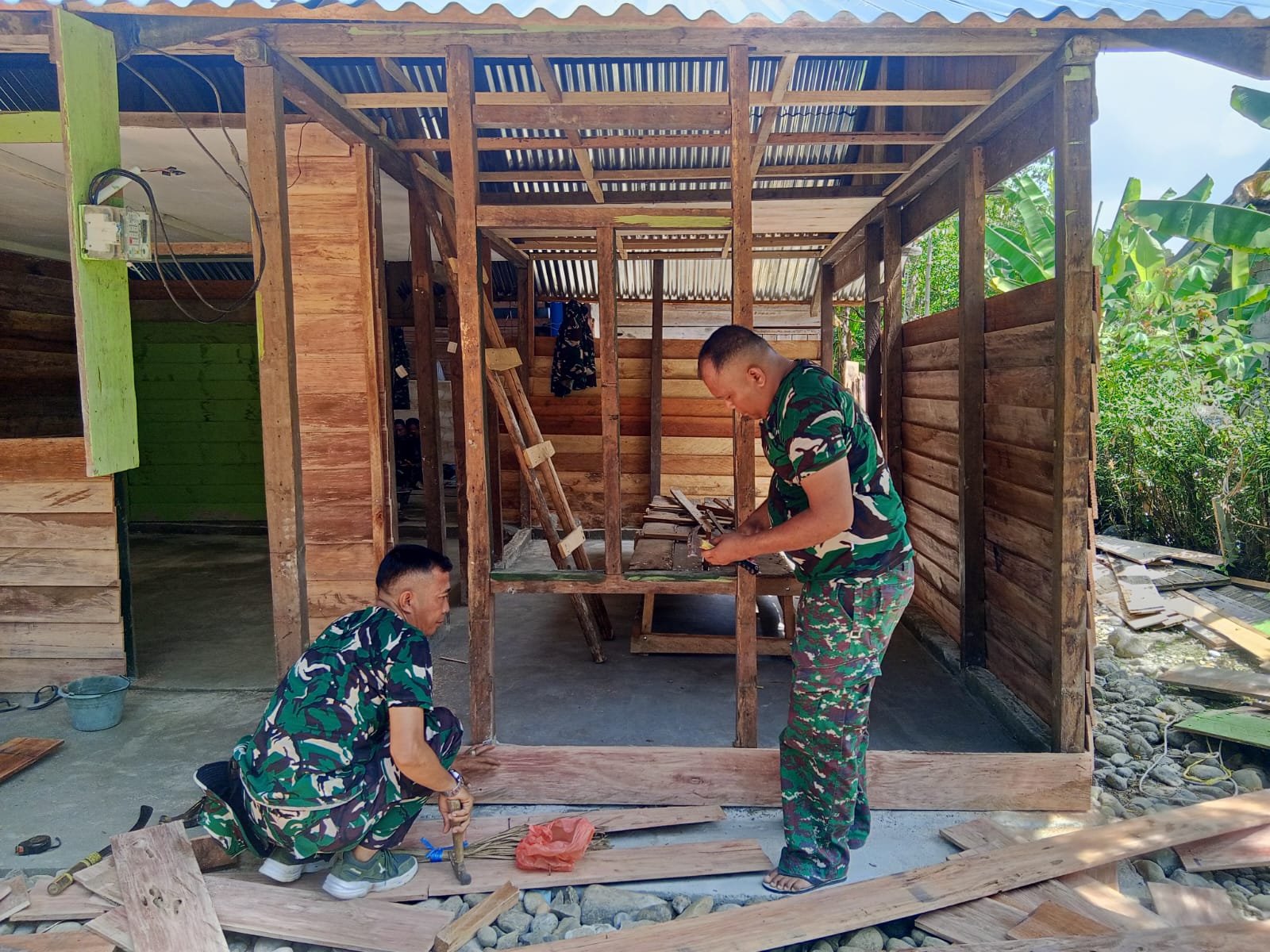 Sejak pengerjaan dimulai, prajurit Satgas TMMD bekerja tanpa mengenal lelah. Mereka membongkar bagian rumah yang tak lagi kuat, lalu menggantinya dengan material baru. Suara palu beradu menjadi irama perubahan yang perlahan menghidupkan kembali bangunan tersebut.