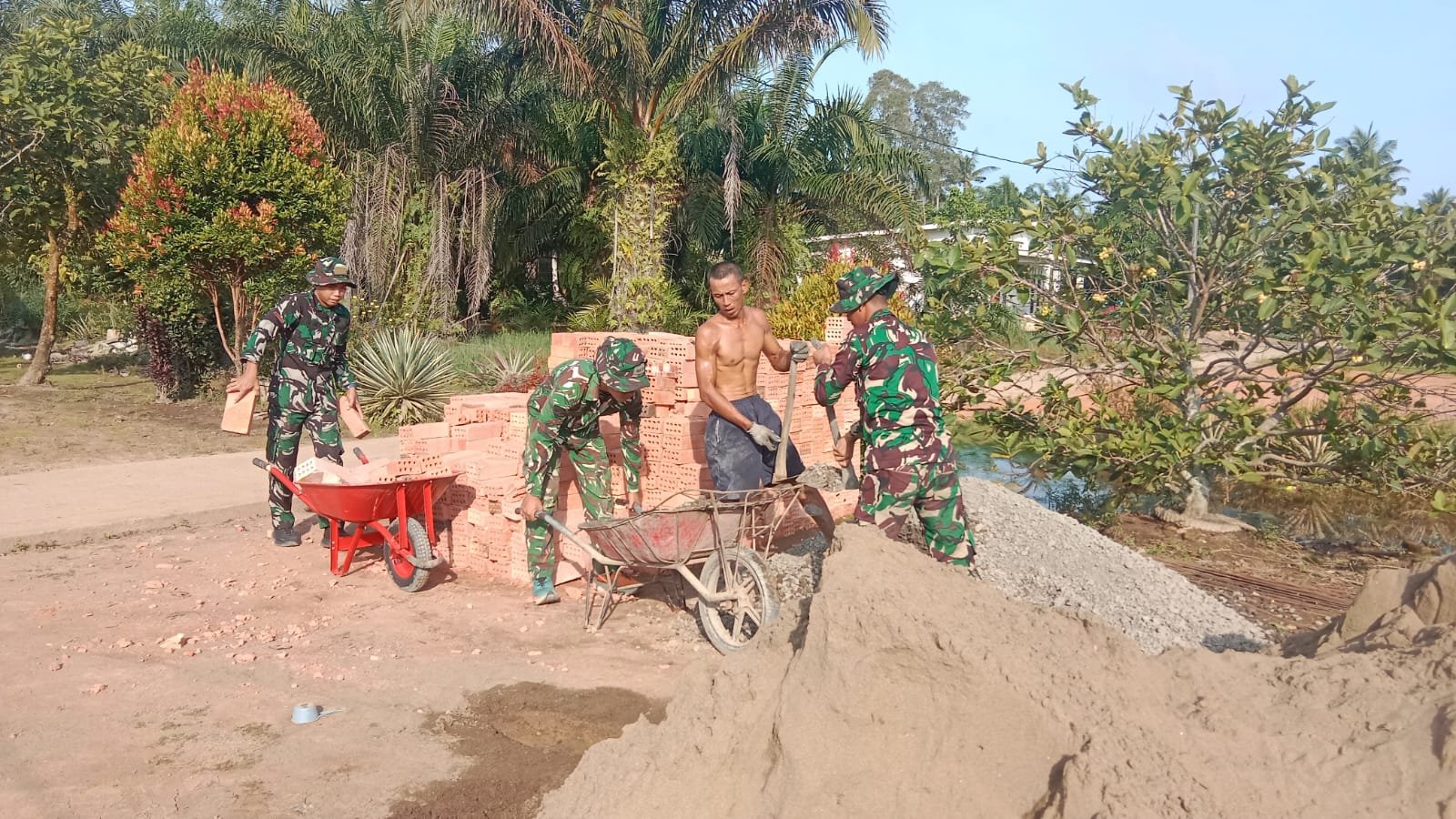 Proses pemasangan pondasi dilakukan secara gotong royong antara anggota Satgas TMMD dan masyarakat setempat. Keterlibatan warga tidak hanya mempercepat pelaksanaan pekerjaan, tetapi juga mempererat hubungan antara TNI dan masyarakat.
