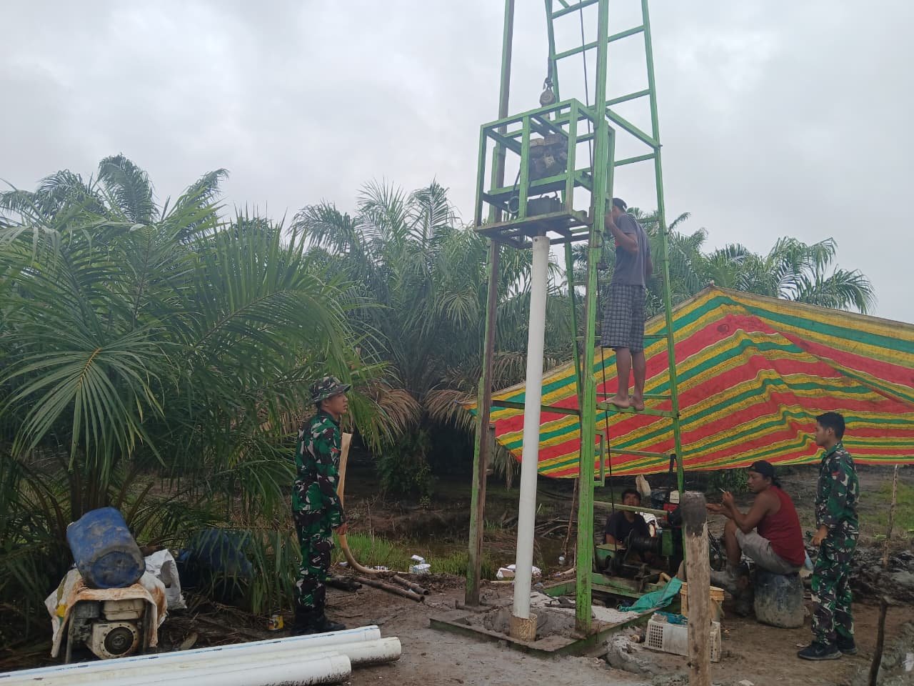 Banyuasin – Dalam upaya memastikan target program terlaksana sesuai dengan waktu yang telah ditetapkan, anggota Satgas TNI Manunggal Membangun Desa (TMMD) ke-127 dari Kodim 0430/Banyuasin berupaya keras untuk mempercepat pembangunan sumur bor di titik ketiga. Lokasi sumur bor ini terletak di belakang Kantor Kepala Desa Wonosari, Kecamatan Pulau Rimau.