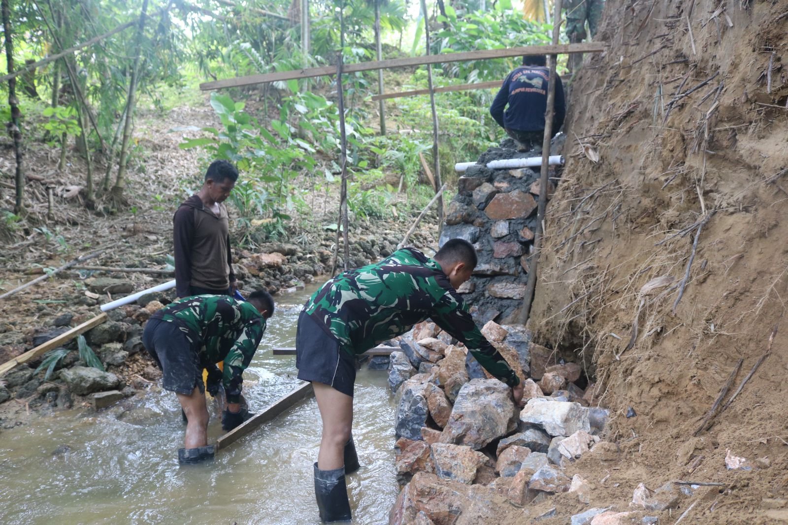 KENDARI – Di bawah terik sinar matahari yang menyengat, anggota Satgas TMMD ke-127 dari Kodim 1417/Kendari secara aktif melanjutkan pembangunan talud di Kelurahan Anggoeya pada Rabu (4/3). Pemasangan setiap susunan batu dilakukan dengan teliti untuk membentuk struktur tembok penahan tanah yang kuat. Talud ini direncanakan untuk melindungi kawasan pemukiman dari dampak abrasi serta risiko longsor, terutama pada saat musim hujan.