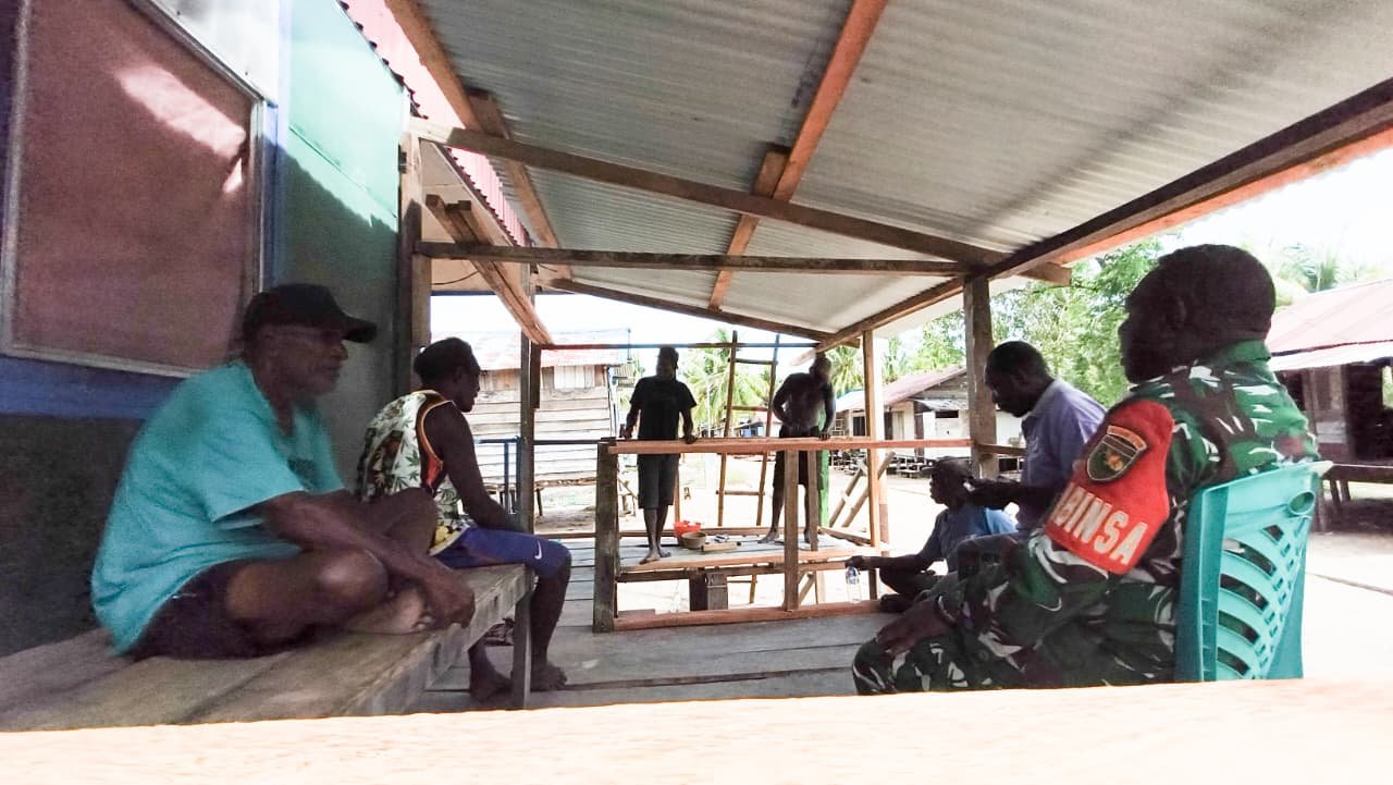Mimika — Untuk mempererat hubungan dengan masyarakat, anggota Satgas TMMD Reguler ke-128 Kodim 1710/Mimika, Sertu Amandus Mutiyu, melakukan kegiatan komunikasi sosial (komsos) dengan warga Kampung Keakwa, Distrik Mimika Tengah, pada hari Sabtu, 25 April 2026.