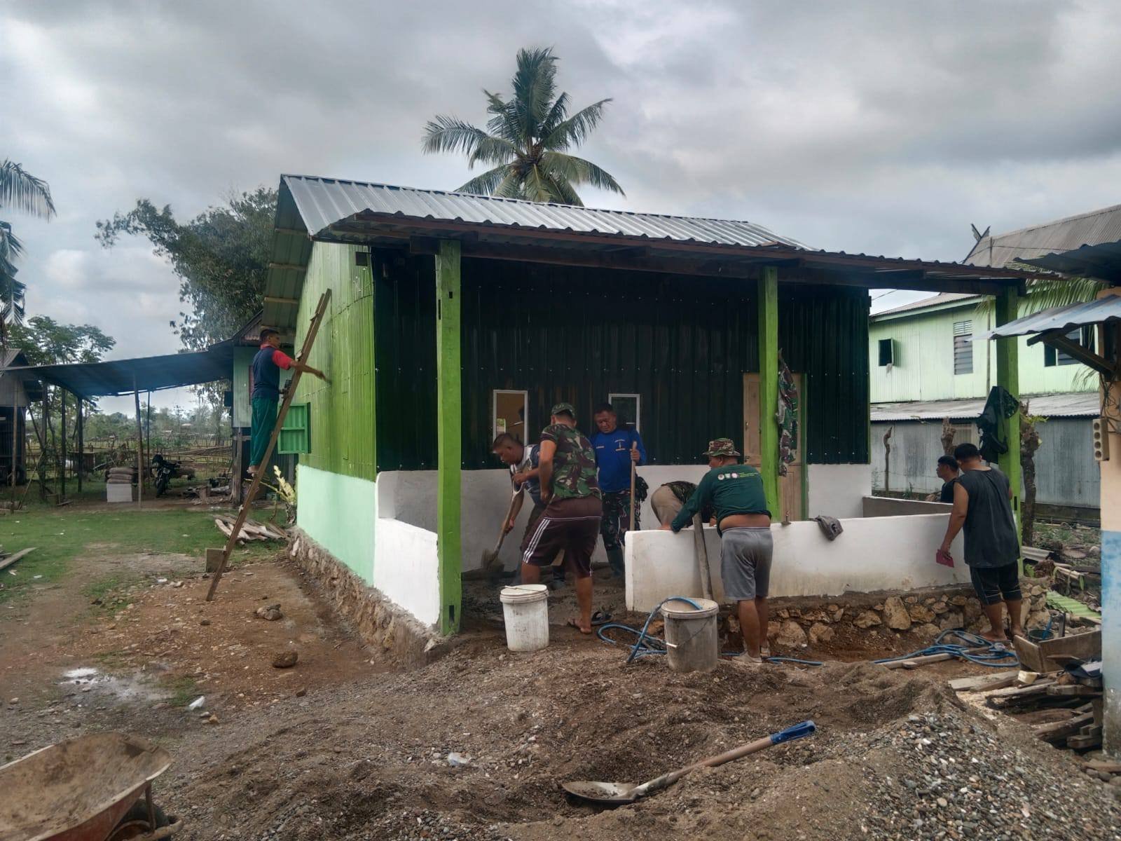 Kegiatan yang dipimpin oleh Serma Rumpa selaku Batuud Koramil 1421-04/Labakkang ini sudah memasuki hari ke-27 pelaksanaan. Adapun sasaran pekerjaan hari ini meliputi ,Pemasangan plamur, Pengecatan dinding, Pemasangan lantai dan Pengaturan material bangunan.