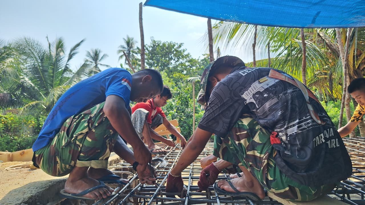 Kendari – Satgas TNI Manunggal Membangun Desa (TMMD) ke-127 dari Kodim 1417/Kendari bersama masyarakat setempat aktif mempercepat proses perakitan struktur besi jembatan di Kelurahan Sambuli pada Rabu (25/2). Meskipun cuaca cukup panas, aktivitas ini berlangsung di bawah terpal biru untuk menjaga kenyamanan pekerja dan memastikan proyek tetap berjalan sesuai rencana.