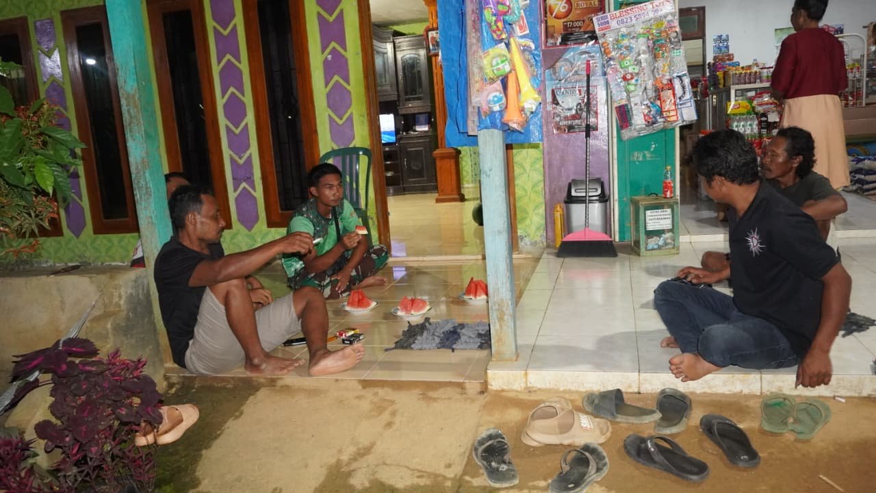 Setelah menyelesaikan berbagai tugas fisik yang memerlukan tenaga ekstra, para prajurit berkumpul di rumah salah satu warga untuk bersantai. Dalam suasana yang hangat dan akrab, terlihat para anggota Satgas dan masyarakat saling berdiskusi dengan santai sambil menikmati malam yang damai.
