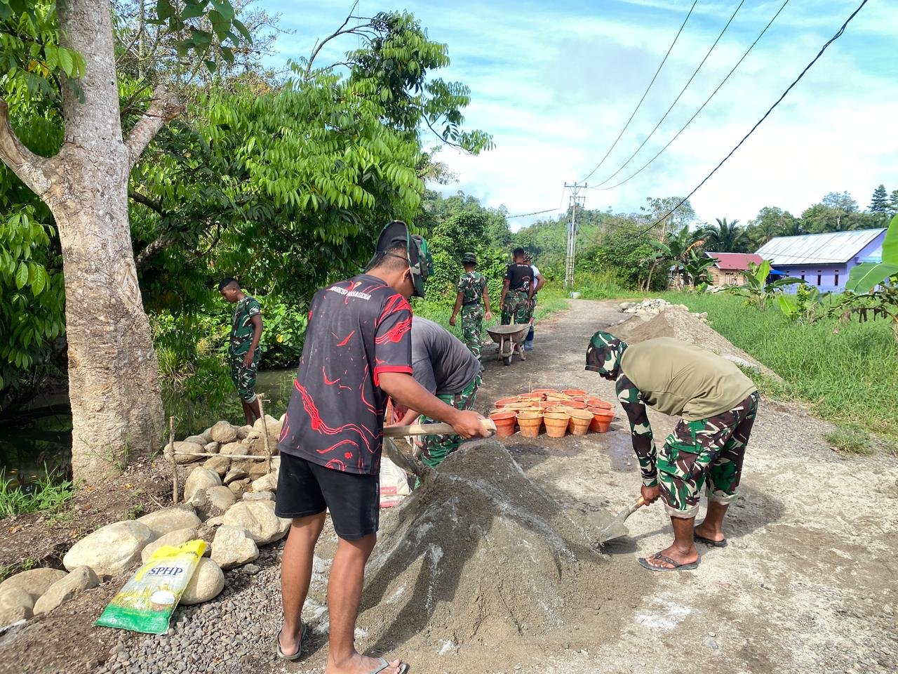 Dalam pelaksanaannya, anggota Satgas TMMD bekerja sama dengan masyarakat setempat dalam menyusun batu, melakukan pengecoran, dan memperkuat pondasi talud agar konstruksi yang dihasilkan mampu bertahan dalam jangka panjang.