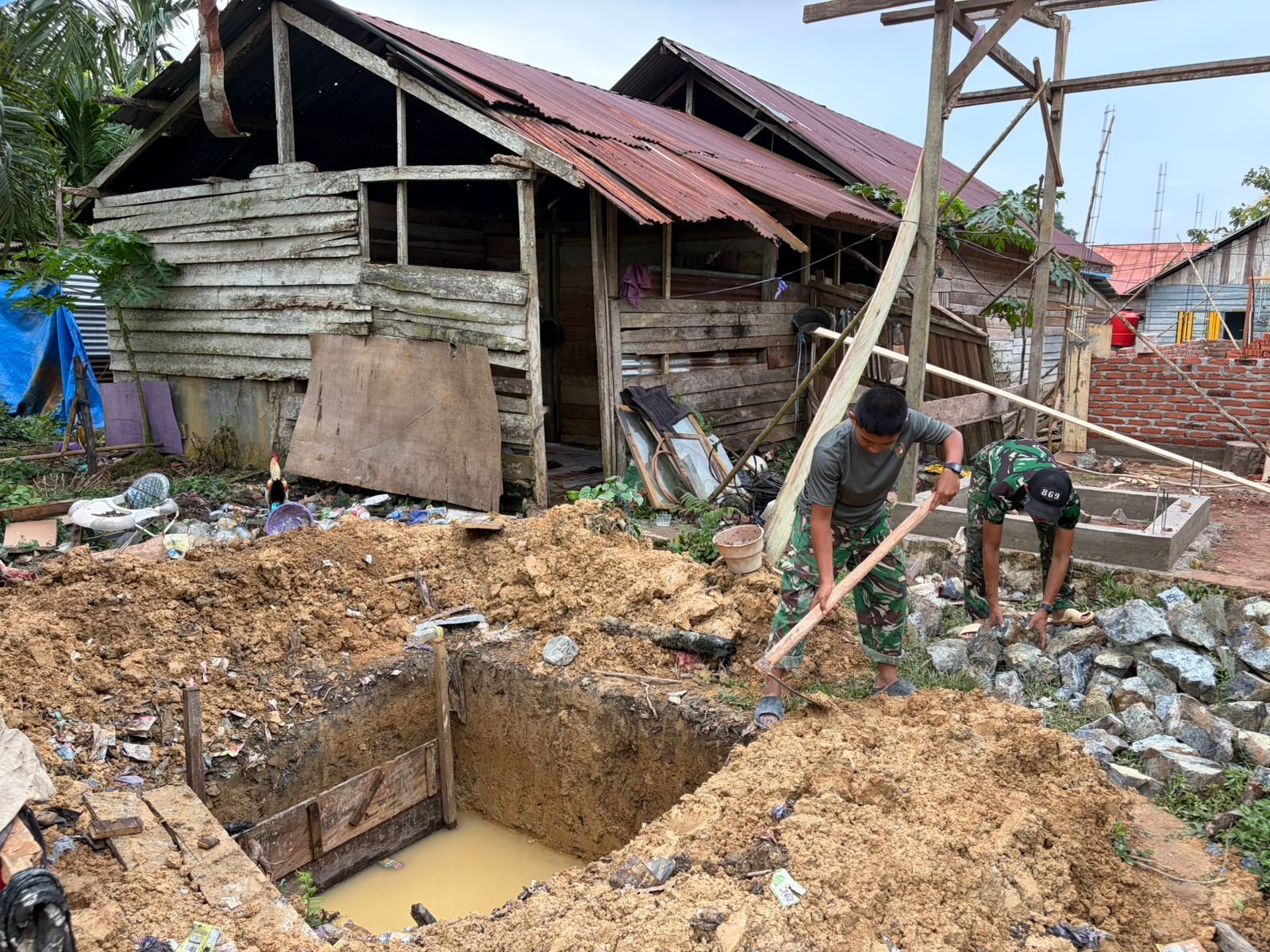Amolame, Rabu (29/4/2026) — Pembangunan Mandi, Cuci, Kakus (MCK) di Desa Amolame dalam program TMMD ke-128 oleh Kodim 1430/Konawe Utara telah dimulai. Para anggota Satgas TMMD bersama dengan masyarakat setempat melaksanakan langkah awal yang di saat ini adalah penggalian tanah untuk MCK yang akan dibangun untuk Bapak Hasruddin.