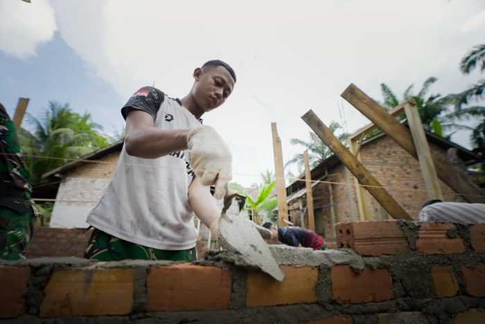 Keringat yang bercucuran adalah simbol nyata dari kerja keras para prajurit. Tanpa henti, mereka fokus memastikan setiap bata terpasang dengan baik demi memberikan hunian yang aman bagi masyarakat setempat.