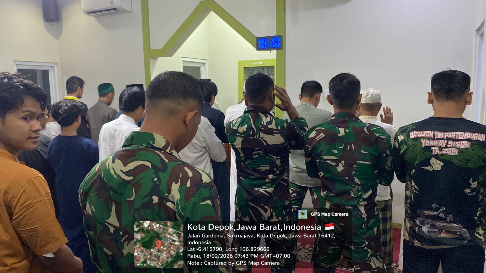 Pada Kamis malam, 19 Februari 2026, anggota dari Kodim 0508/Depok melaksanakan sholat Tarawih bersama dengan warga di Mushalla Ar Rahman, yang terletak di Jl. GDC Sektor Gardenia, Kelurahan Tirtajaya, Kecamatan Sukmajaya.