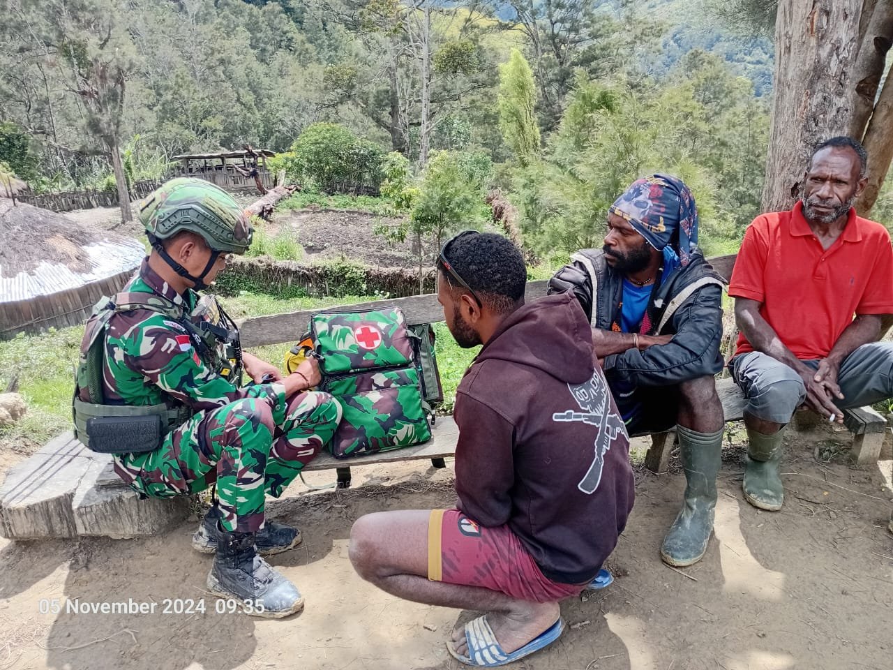 LANNY JAYA – Dalam rangka mensejahterakan masyarakat Satgas Yonif 614/Raja Pandhita Pos Tima memberikan pelayanan kesehatan gratis kepada masyarakat Kampung Tima, Distrik Balingga, Kabupaten Lanny Jaya, Papua Pegunungan, Selasa (05/11).