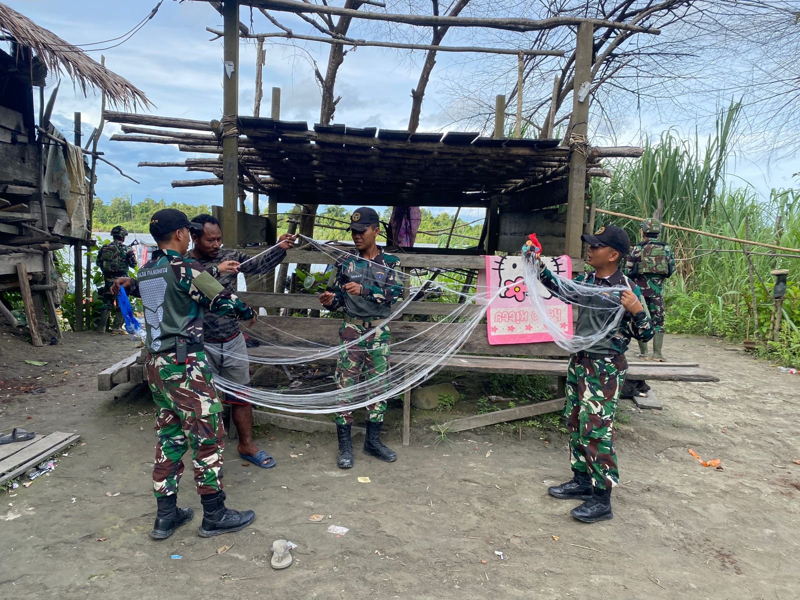 MEMBERAMO RAYA – Pos Dabra Satgas Yonif 614/RJP yang dipimpin oleh Sertu Irwan bersama beberapa personel melaksanakan Komunikasi Sosial (Komsos) langsung bersama para nelayan di Kampung Dabra, Distrik Memberamo Hulu, Kabupaten Memberamo Raya, Papua sekaligus menyerahkan jaring ikan kepada nelayan kampung Dabra, Senin (23/12).