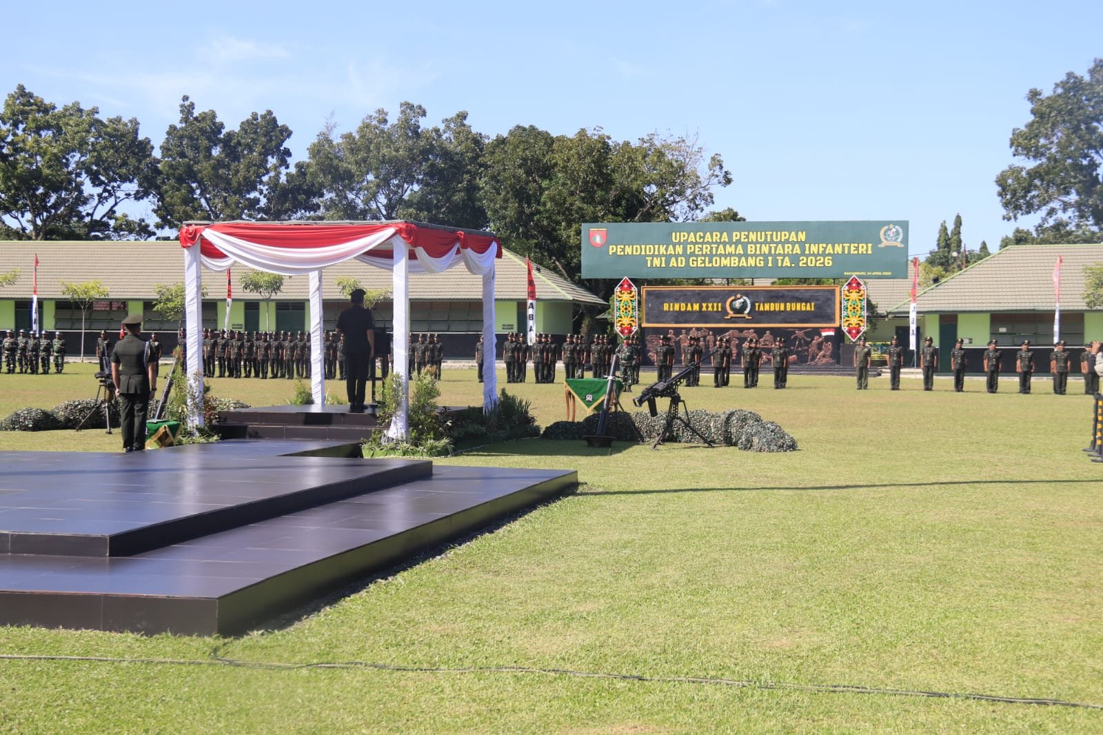 Banjarbaru – Kodim 1006/Banjar turut menghadiri Upacara Penutupan Pendidikan Pertama Bintara Infanteri TNI AD Gelombang I Tahun Anggaran 2026 yang digelar di Lapangan Lambung Mangkurat Rindam XXII/TB, Banjarbaru, Jumat (24/4/2026). Pada kegiatan tersebut, Kodim 1006/Banjar diwakili Kapten Cba Sutarno sebagai bentuk dukungan terhadap proses pembinaan dan pendidikan calon prajurit TNI AD.