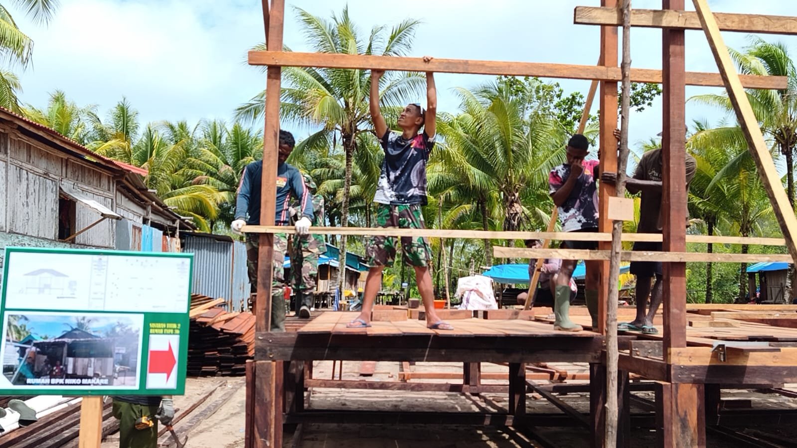 Mimika — Dalam pelaksanaan program TMMD ke-128 Kodim 1710/Mimika, terlihat kembali semangat gotong royong di Kampung Keakwa, khususnya dalam pembangunan rumah Bapak Niko Makare.