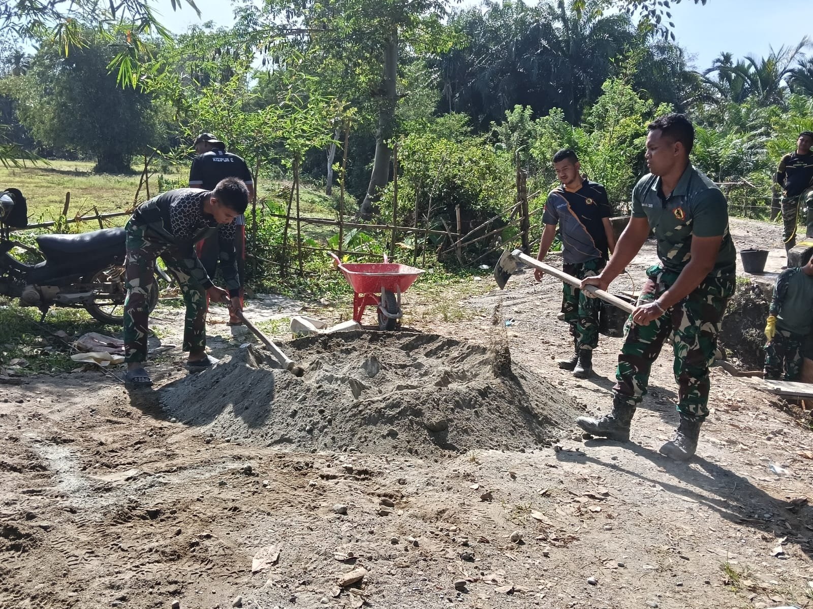 Di bawah komando Dansatgas Letkol Inf S. Kembaren, S.E., M.I.P., CFrA., personel Satgas dan warga kompak melanjutkan pengecoran Talud Penahan Timbunan (TPT). Tak ada sekat, tak ada jarak. Yang ada hanya semangat gotong royong demi menghadirkan jalan yang kuat dan aman.