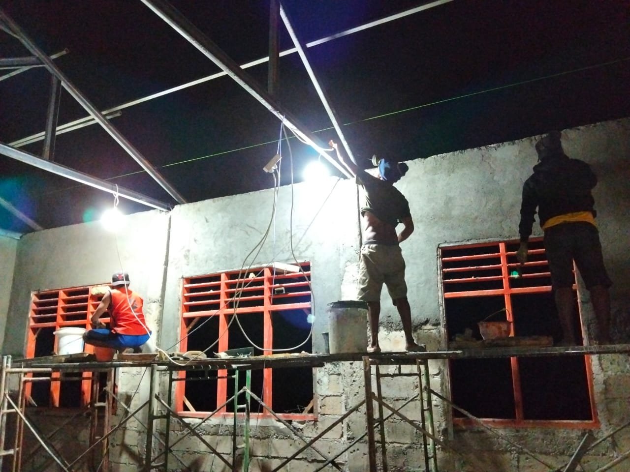 Fokus pengerjaan malam ini terletak pada proses plester dinding. Dengan ketelitian yang tinggi, setiap bidang dinding dirapikan demi menghasilkan konstruksi yang kuat dan siap untuk melanjutkan tahap berikutnya. Semangat pengabdian terlihat pada diri setiap anggota, meskipun mereka harus bekerja hingga larut malam.