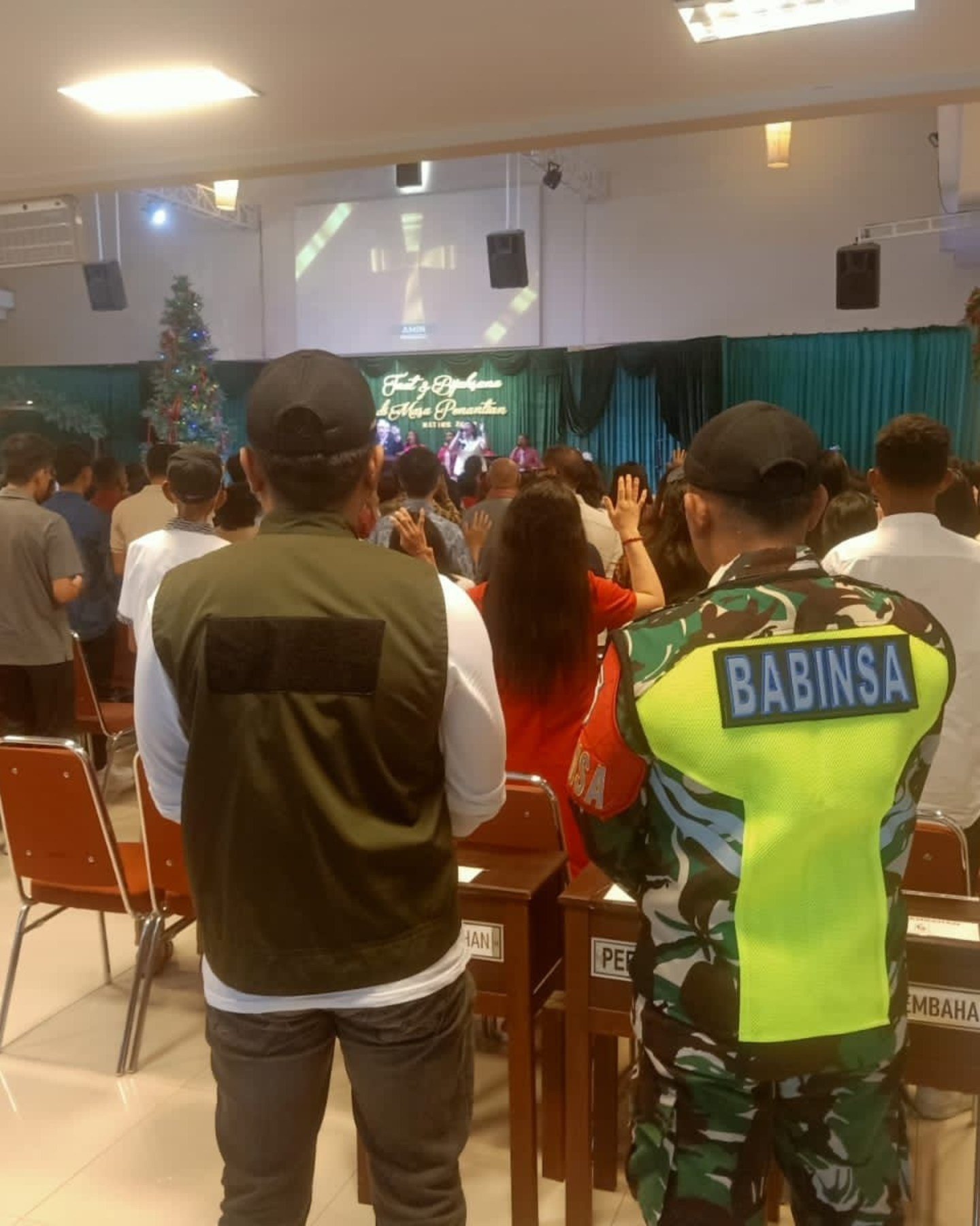 Mataram, NTB – Perayaan Natal yang diadakan oleh jemaat Kristiani dan Protestan di Cakranegara, Kota Mataram, pada Kamis, 25 Desember 2025, berjalan dengan aman dan penuh khidmat. Pelaksanaan ibadah ini berlangsung tanpa kendala, didukung oleh sinergi yang kuat antara Bintara Pembina Desa (Babinsa) dari Komando Rayon Militer (Koramil) 1606-01/Cakranegara, pecalang, serta petugas Linmas yang secara aktif mengawasi keamanan di sekitar gereja.