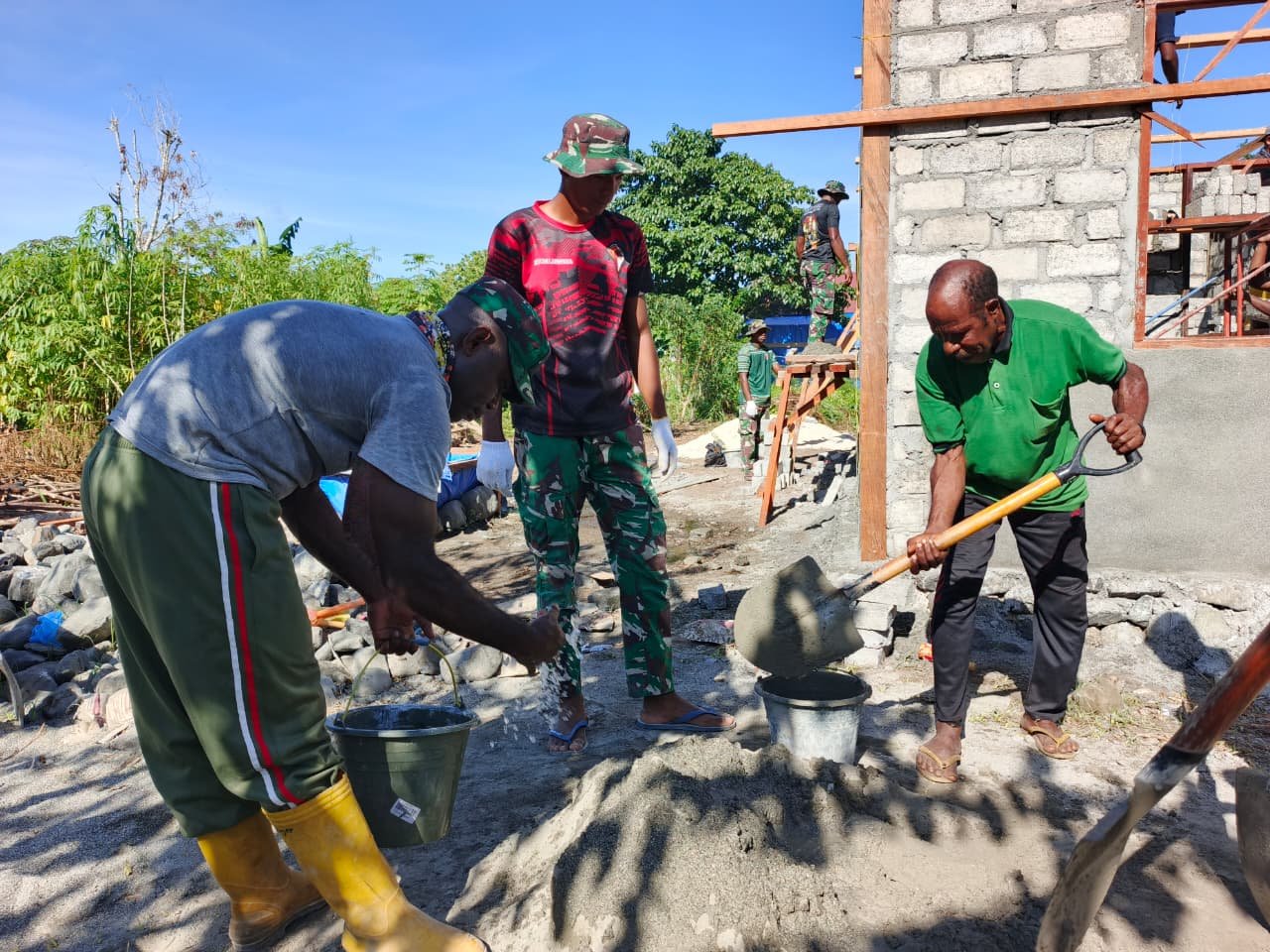 Manokwari Utara — Kerjasama yang harmonis antara Satgas TMMD ke-128 Kodim 1801/Manokwari dan masyarakat setempat terlihat jelas saat proses pembangunan rumah di Kampung Tanah Rubuh.