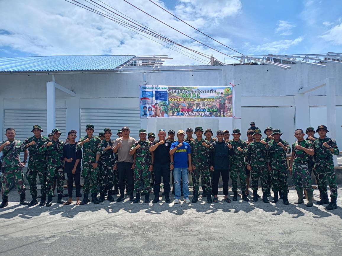 BITUNG – Dalam upaya mendukung Gerakan Indonesia Asri, personel dari Kodim 1310/Bitung dan Yonif TP 916/Bara Sakti Kodam XIII/Merdeka berkolaborasi dengan warga setempat untuk melaksanakan kegiatan Karya Bakti pembersihan lingkungan. Acara ini berlangsung pada Rabu (18/03/2026) bertempat di Kompleks Kanopi, Kelurahan Bitung Timur, Kecamatan Maesa, Kota Bitung.