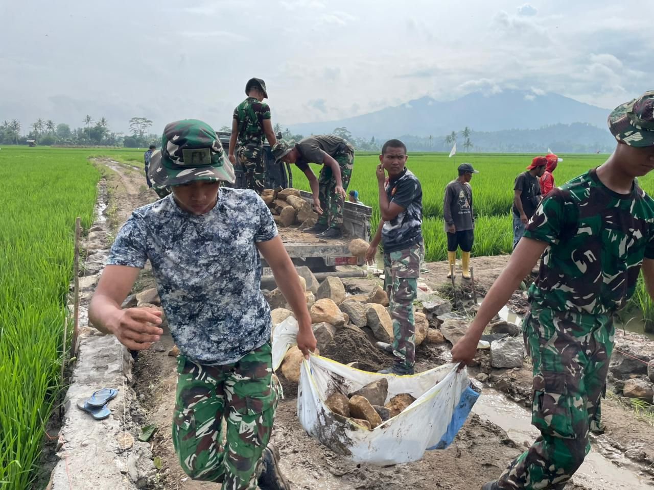 Kecamatan Way Khilau, Kabupaten Pesawaran, Provinsi Lampung – Anggota TNI yang tergabung dalam Satgas TMMD ke-127 Kodim 0421/LS bersama masyarakat setempat menunjukkan dedikasi luar biasa dalam kegiatan gotong royong memindahkan material untuk pembangunan infrastruktur di Desa Gunung Rejo. Kegiatan ini melibatkan pemindahan batu dan pasir berat ke lokasi proyek, mencerminkan semangat kolektif antara prajurit dan warga.