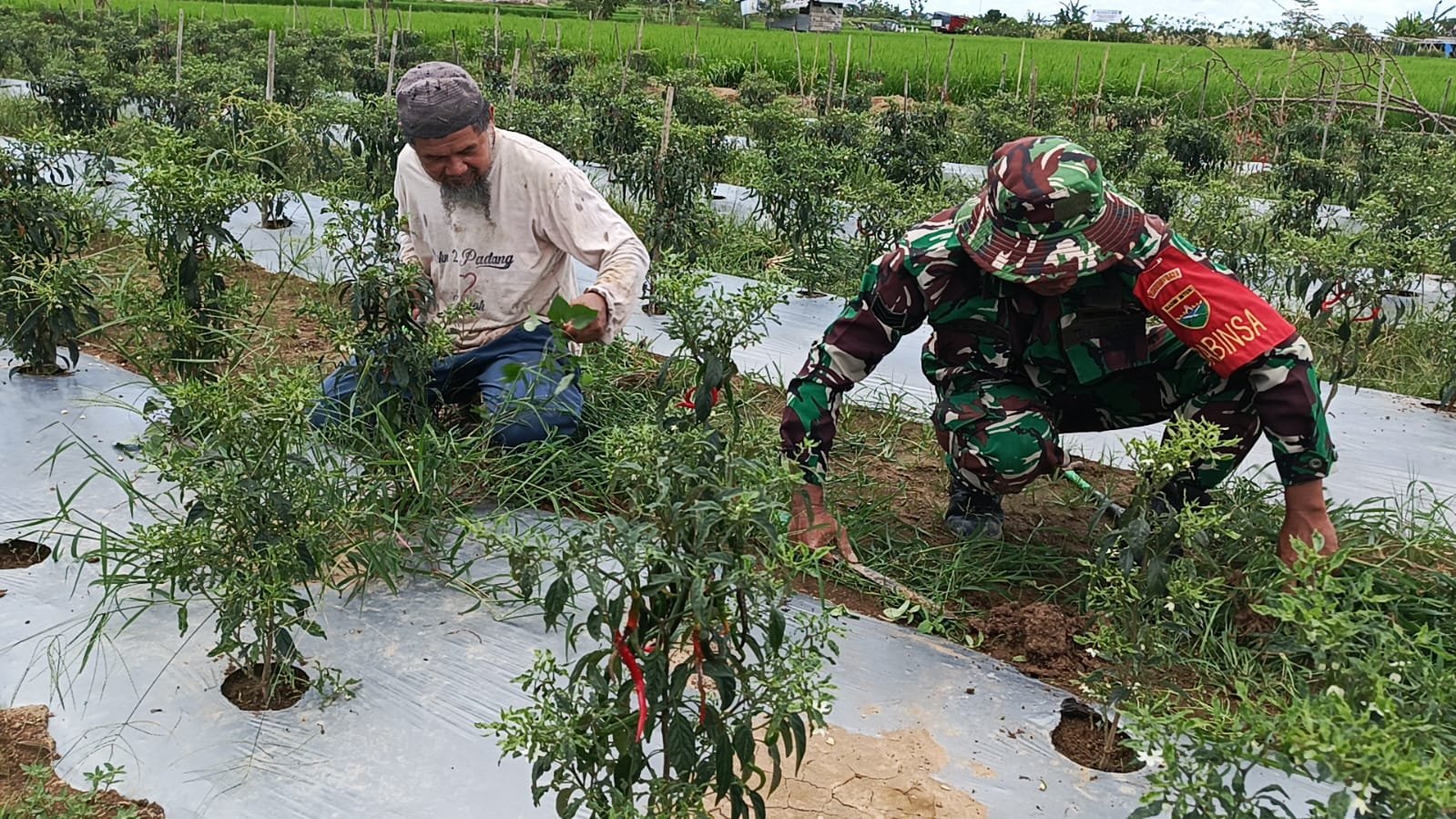Dalam kegiatan tersebut, personel dari Kodim 0428/MukoMuko tidak hanya memberikan arahan teoritis, namun juga terjun langsung ke lapangan untuk membersihkan hama dan gulma yang mengganggu pertumbuhan tanaman cabe. Ini dilakukan dalam semangat kebersamaan dan gotong royong, di mana petani dan anggota TNI bekerja bahu-membahu merawat tanaman.