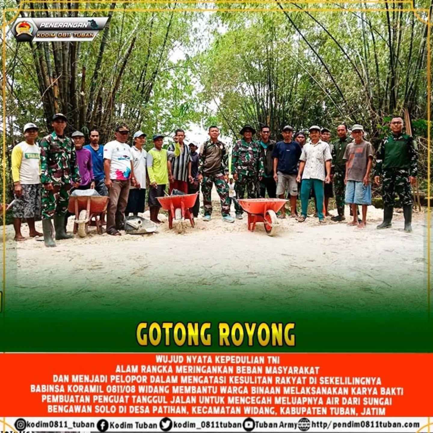 TUBAN – Dalam upaya menjaga keselamatan masyarakat di Desa Patihan, Kecamatan Widang, Kabupaten Tuban, anggota Babinsa dari Koramil 0811/08 Widang melaksanakan kegiatan gotong royong pada [hari/tanggal]. Kegiatan ini ditujukan untuk membangun penguat tanggul jalan yang diharapkan dapat mencegah meluapnya air dari Sungai Bengawan Solo saat hujan deras, yang berpotensi merendam jalan serta mengganggu aktivitas warga setempat.