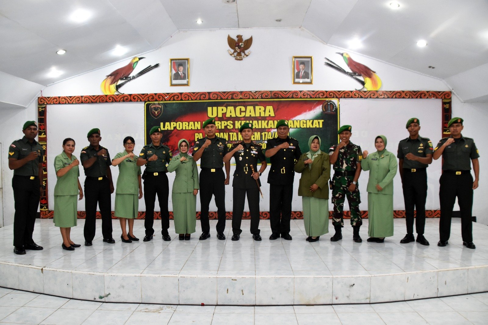 MERAUKE – Bertempat di Aula Anim Ha Makodim 1707/Merauke, Jalan Raya Mandala, Kabupaten Merauke, Provinsi Papua Selatan, Rabu (1/4/2026), telah dilaksanakan acara Korps Kenaikan Pangkat Perwira, Bintara, dan Tamtama Korem 174/ATW dan Kodim 1707/Merauke. Kegiatan berlangsung khidmat dipimpin langsung oleh Danrem 174/ATW Brigjen TNI Mustakim, S.I.P., M.Si., yang dihadiri sedikitnya 80 peserta terdiri dari anggota dan Persit Kartika Chandra Kirana Koorcab Rem 174/ATW beserta jajaran.