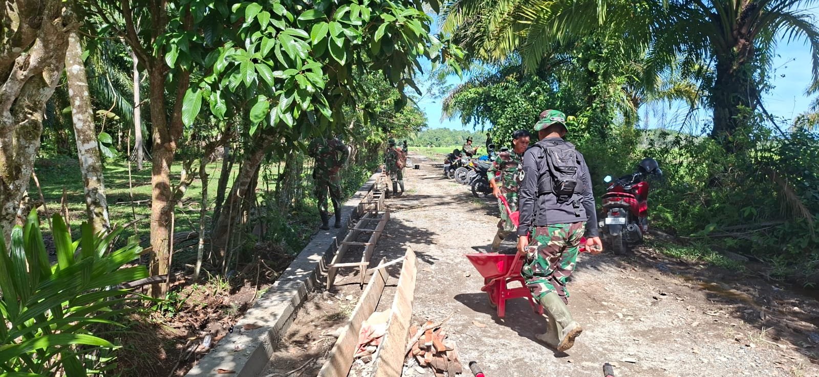 Personel Satgas TMMD Reguler ke-127 Kodim 0105/Abar bekerja berdampingan dengan warga, membangun tanpa sekat. Suasana lapangan terasa seperti keluarga besar yang saling membantu.