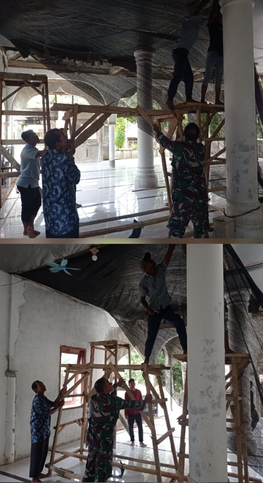 Masjid tersebut masih dalam kondisi yang cukup bagus, akan tetapi memerlukan beberapa perbaikan, khususnya pada pemasangan plafon dan seng (atap) masjid. Dalam kegiatan ini, Babinsa bersama warga melakukan pekerjaan perbaikan pada bagian pemasangan plafon dan atap masjid dengan bergotong royong membongkar bagian plafon dan seng (atap) yang sudah rusak, kemudian menggantinya dengan bahan yang baru.