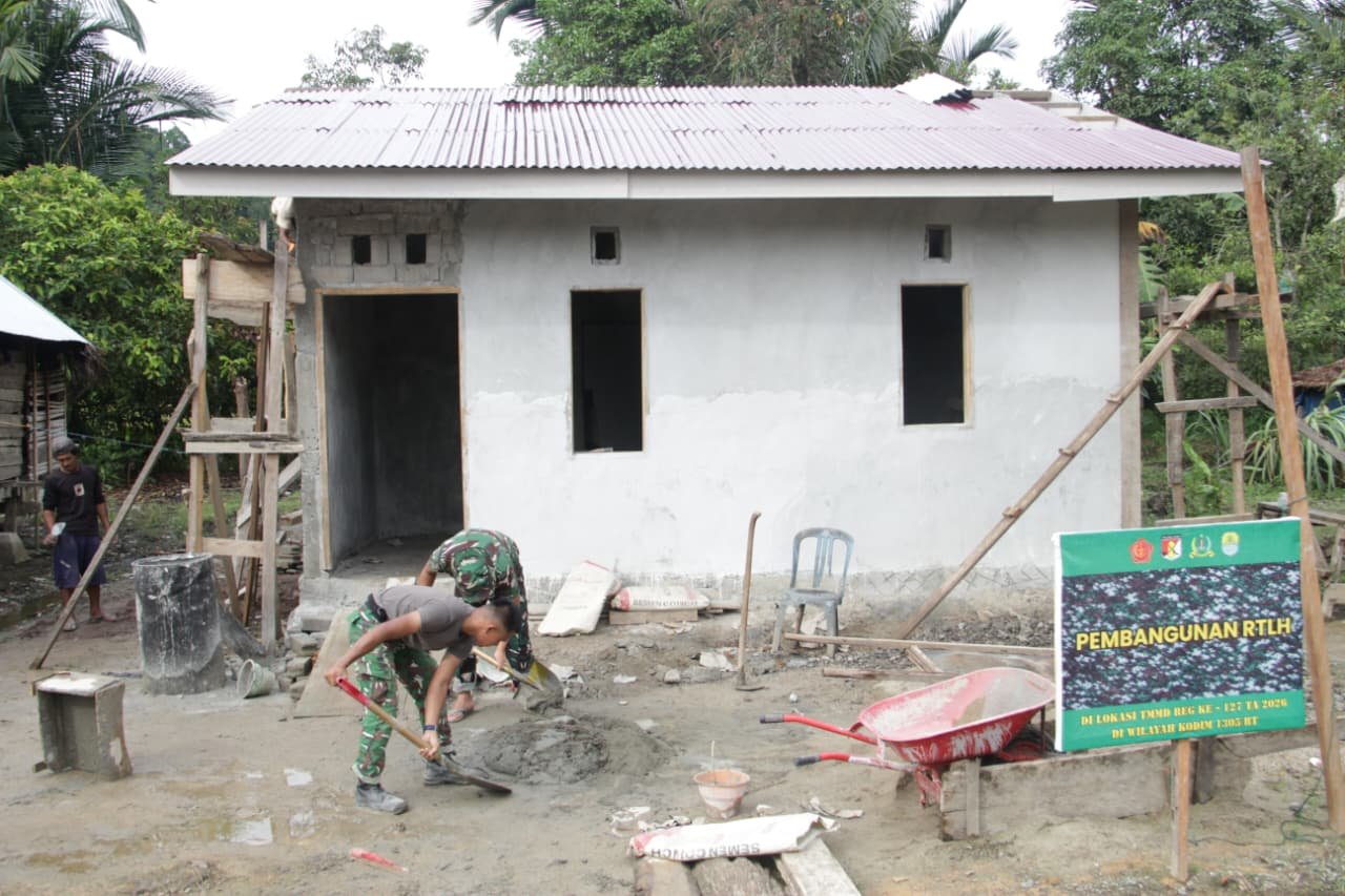 Tolitoli – Dalam upaya mempercepat penyelesaian target fisik, Satgas TMMD ke-127 yang berada di bawah Kodim 1305/Buol Tolitoli terus melaksanakan pembangunan Rumah Tidak Layak Huni (RTLH) di Dusun Ogomolobu, Desa Oyom, Kecamatan Lampasio, Kabupaten Tolitoli, pada hari Minggu (22/2/2026).