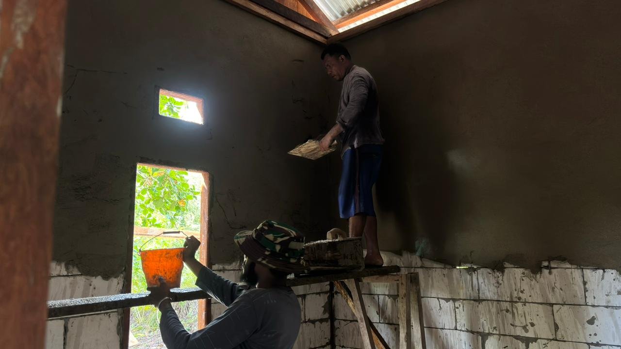 Kegiatan pemasangan plester ini merupakan tahapan penting dalam pembangunan rumah, bertujuan untuk meningkatkan kualitas bangunan agar lebih kuat dan layak dihuni. Tim Satgas bekerja sama dengan warga setempat dalam proses ini, melaksanakan pekerjaan dengan teliti dan berjenjang.