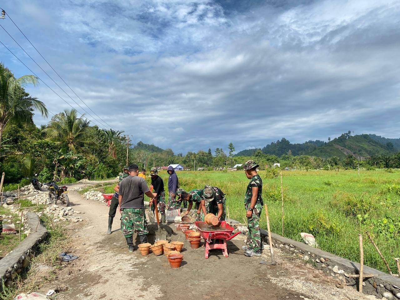 Tolitoli – Tim Satgas TMMD ke-127 dari Kodim 1305/Buol Tolitoli semakin giat dalam melaksanakan pengerasan jalan dengan panjang 650 meter dan lebar 4 meter, serta pembangunan talud sepanjang 1.030 meter di Dusun Ogomolobu, Desa Oyom, Kecamatan Lampasio, Kabupaten Tolitoli, pada Sabtu, 28 Februari 2026.