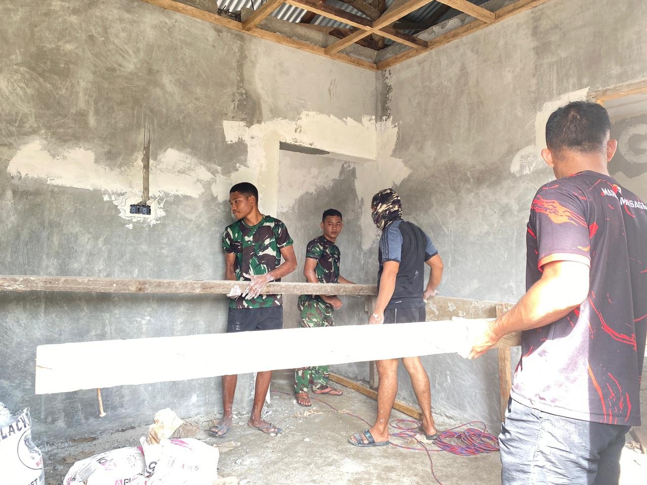 Hari ini, personel Satgas melaksanakan beberapa pekerjaan, antara lain merapikan bagian dalam rumah dan memasang struktur pendukung yang diperlukan. Setiap langkah dikerjakan dengan teliti, guna memastikan hasil akhir yang memuaskan.