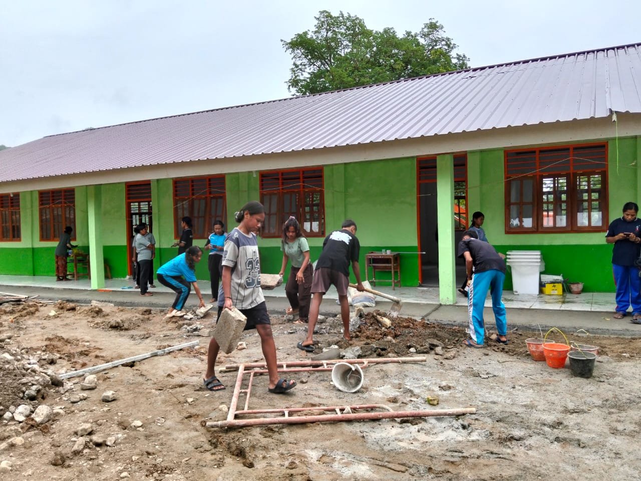 Kegiatan pembersihan ini merupakan bagian dari persiapan menjelang peresmian bangunan yang direncanakan pada hari berikutnya. Dengan penuh semangat, personel Satgas dan siswa bekerja bersama untuk mengangkut sisa material pembangunan, memastikan tidak ada jejak sisa pekerjaan yang tersisa.