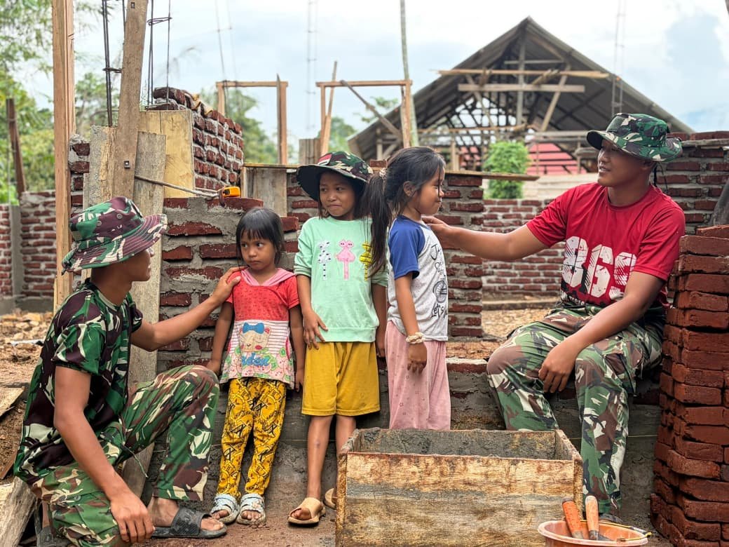 Dalam suasana pembangunan, sejumlah anggota TNI tampak berinteraksi dengan anak-anak lokal dengan penuh kehangatan. Sikap ramah mereka berhasil menciptakan suasana menyenangkan, di mana anak-anak yang awalnya malu-malu berani mendekat dan terlibat dalam obrolan.