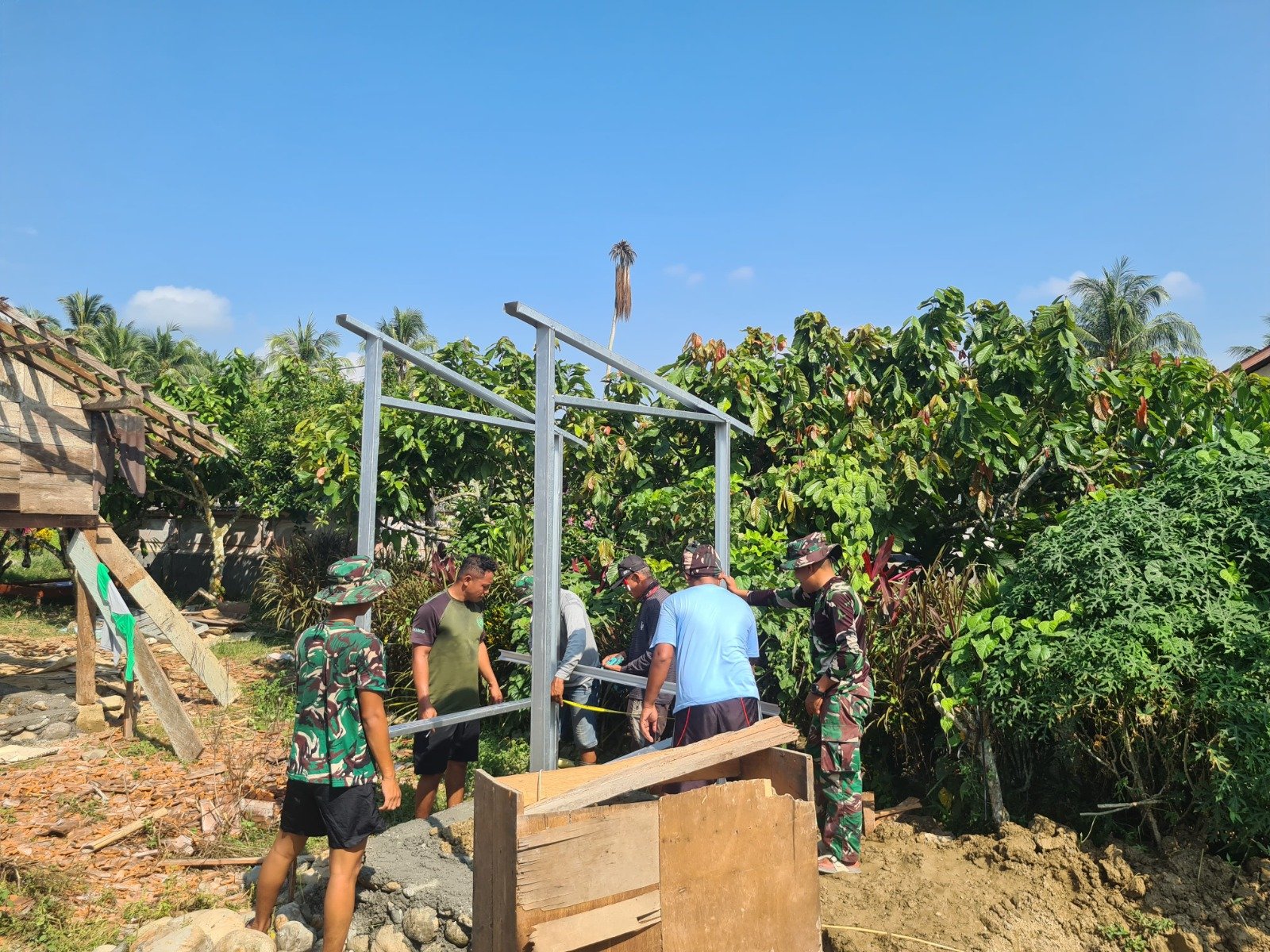 Dari lokasi pembangunan, tampak anggota Satgas TMMD yang dipimpin oleh Letda Inf Rudini sedang bekerja untuk mendirikan struktur MCK. Proses pembangunan ini menunjukkan bahwa TNI sangat peduli terhadap kebutuhan sanitasi yang layak bagi masyarakat.