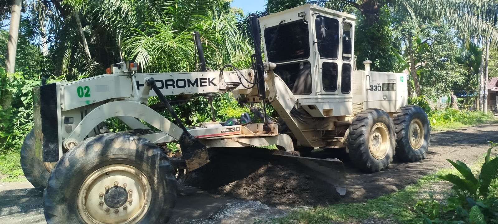 Alat berat itu tampak bergerak perlahan meratakan material sirtu serta membentuk badan jalan agar lebih kuat dan nyaman dilalui.