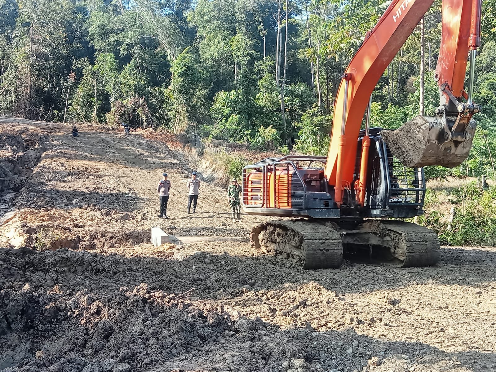 Di lokasi terlihat perpaduan kerja alat berat dan tenaga manusia. Excavator membentuk badan jalan, sementara prajurit memperbaiki bagian yang masih tidak rata.