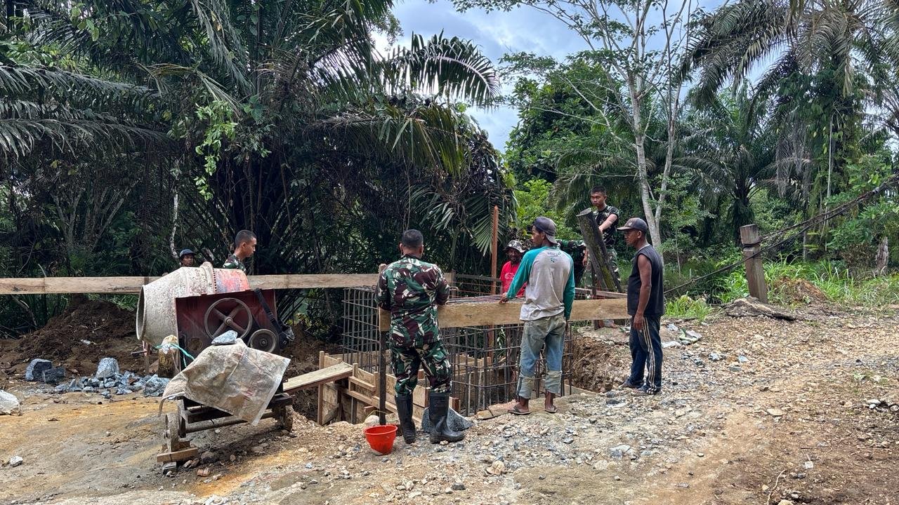 Pembangunan jembatan gantung tersebut dilakukan secara gotong royong dengan melibatkan personel TNI dan warga setempat. Dengan penuh semangat dan tanpa kenal lelah, mereka bahu-membahu mengangkut material, merakit rangka jembatan, hingga memasang konstruksi agar kokoh dan aman digunakan.